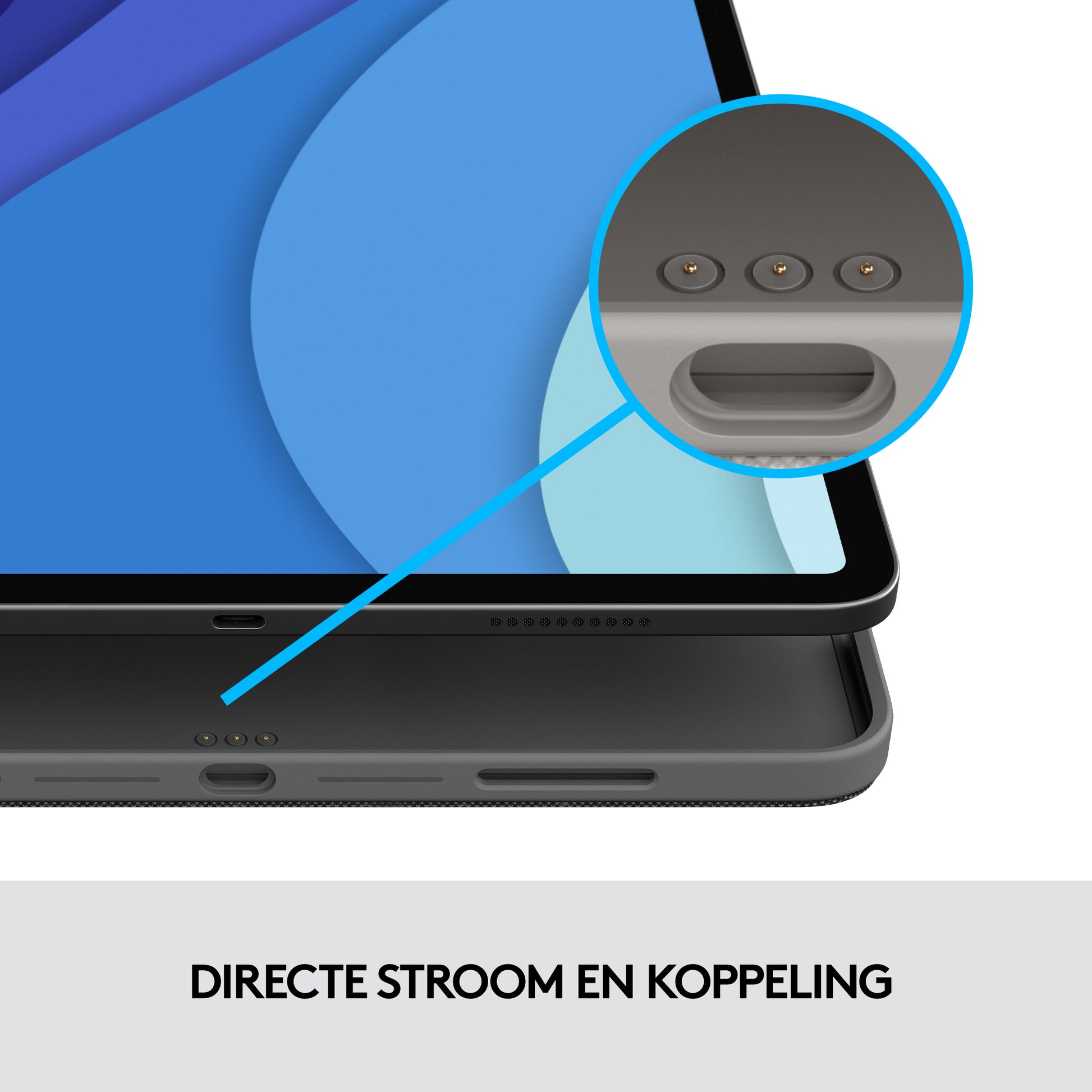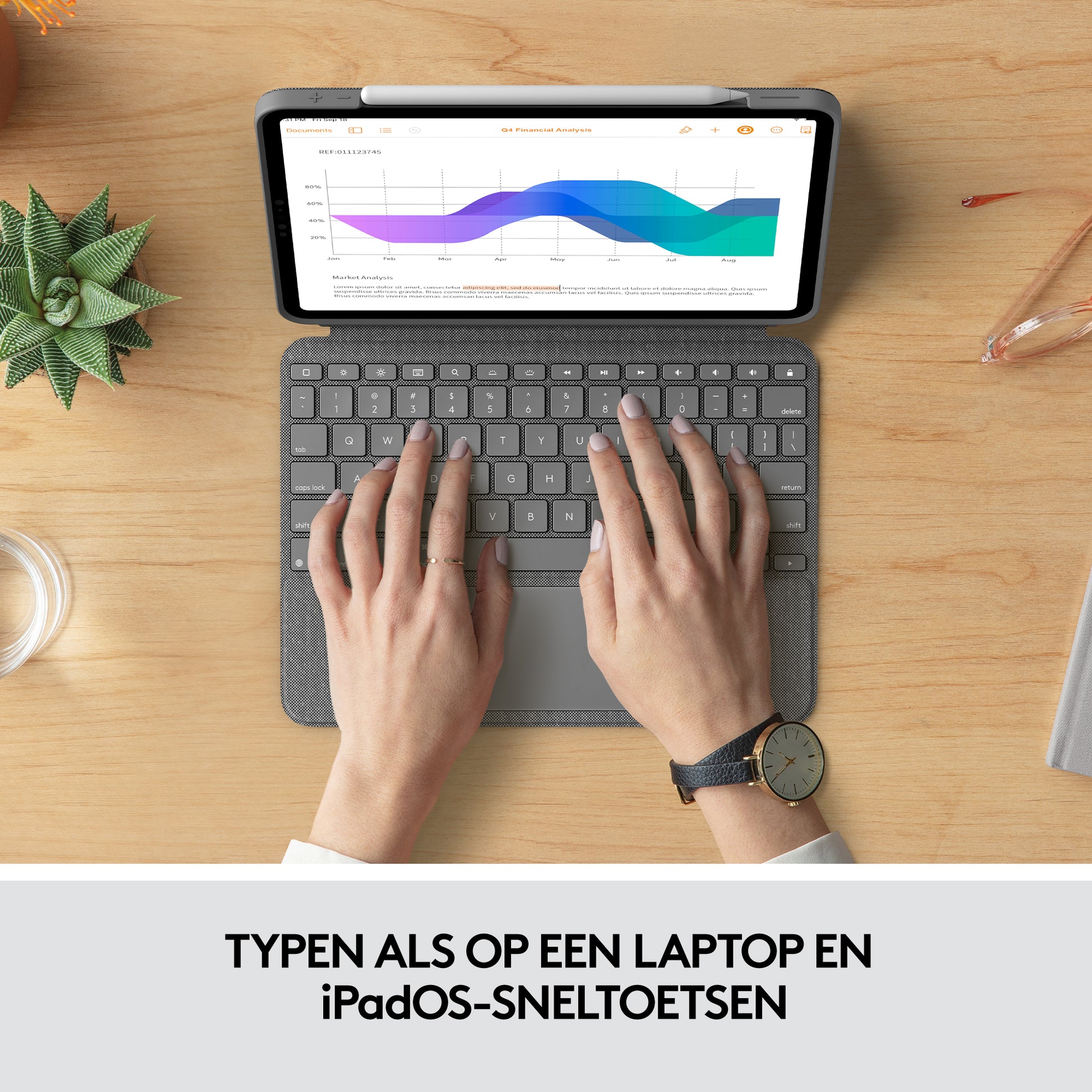 Logitech Combo Touch for iPad Pro 11-inch (1st, 2nd, and 3rd generation). Toetsenbordindeling: AZERTY, Taal toetsenbord: Frans, Aanwijsapparaat: Trackpad. Merkcompatibiliteit: Apple, Compatibiliteit: iPad Pro 11 (4th gen) (A2759, A2435, A2761, A2762) , iPad Pro 11-inch (3rd gen) (A2377, A2459,..., Kleur van het product: Grijs. Connectiviteitstechnologie: Docking, Aansluiting: Smart Connector. Stroombron: Dock. Ondersteunde mobiele besturingssystemen: iPadOS