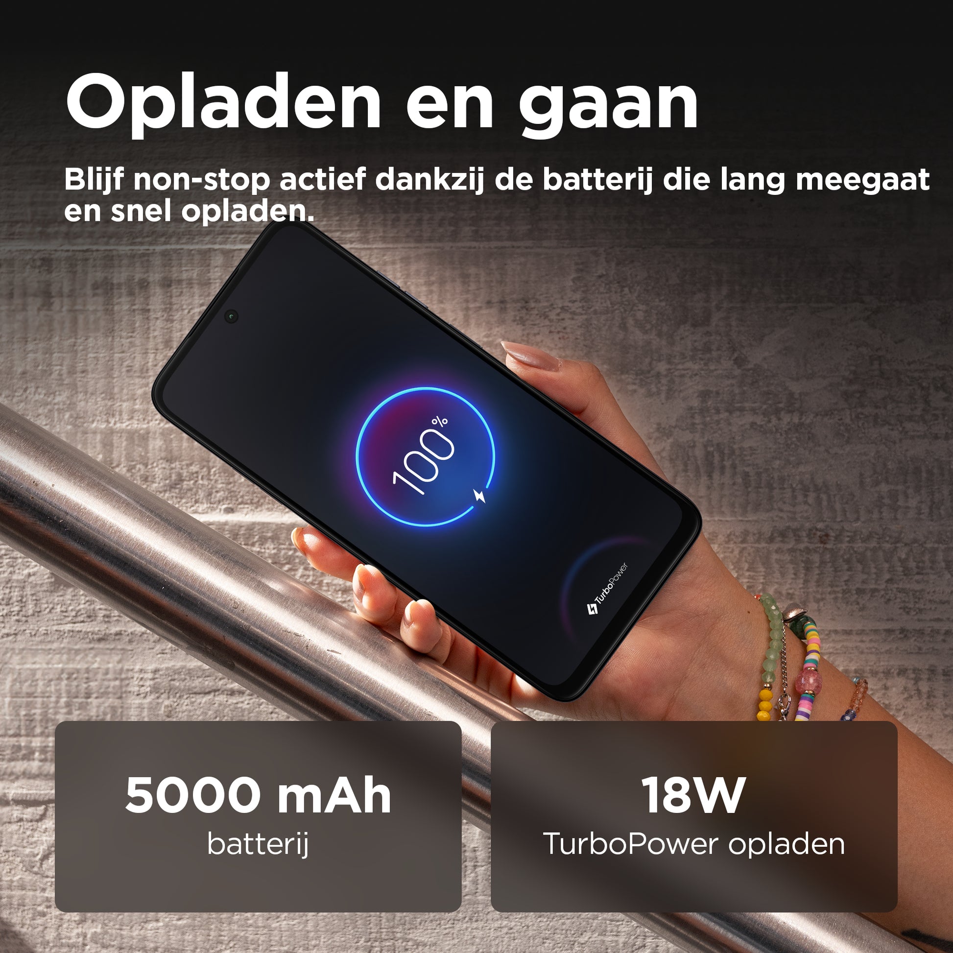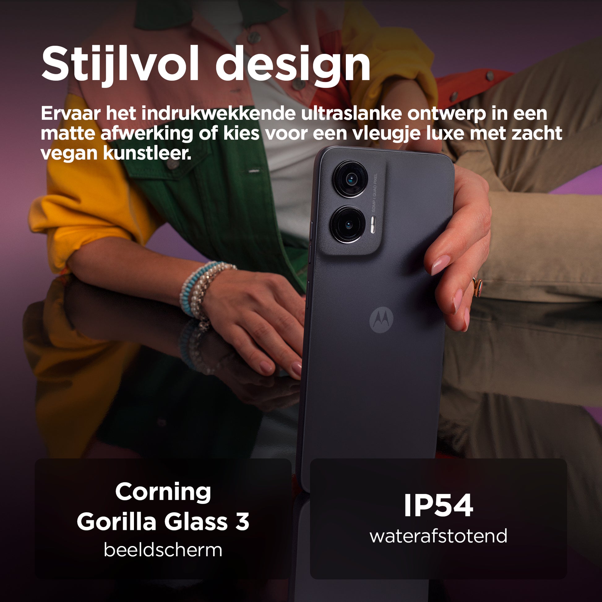 De grootste momenten in het leven verdienen een groot podium. Maak kennis met de moto g35 5G. Met een enorm FHD+-display van 6,72 inch komen je films, games en videogesprekken tot leven, zelfs in helder licht, met een piekhelderheid van 1000 nits. Dat alles wordt aangevuld met multidimensionaal Dolby Atmos®-geluid op stereoluidsprekers of je favoriete hoofdtelefoon. Maak adembenemende opnamen met de ultragroothoeklens of maak scherpe, heldere foto's bij elk licht met de 50 MP-camera met Quad Pixel-technologie. Geniet van het prachtige, superdunne eersteklas design, inclusief een optie met het luxe gevoel van vegan leer. Profiteer van supersnelle 5G met een octa-core processor en krijg 4 GB RAM en maximaal 256 GB opslag.(2,4) Bovendien kun je altijd doorgaan doordat de accu lang meegaat. De moto g35 5G is gemaakt voor grote momenten.