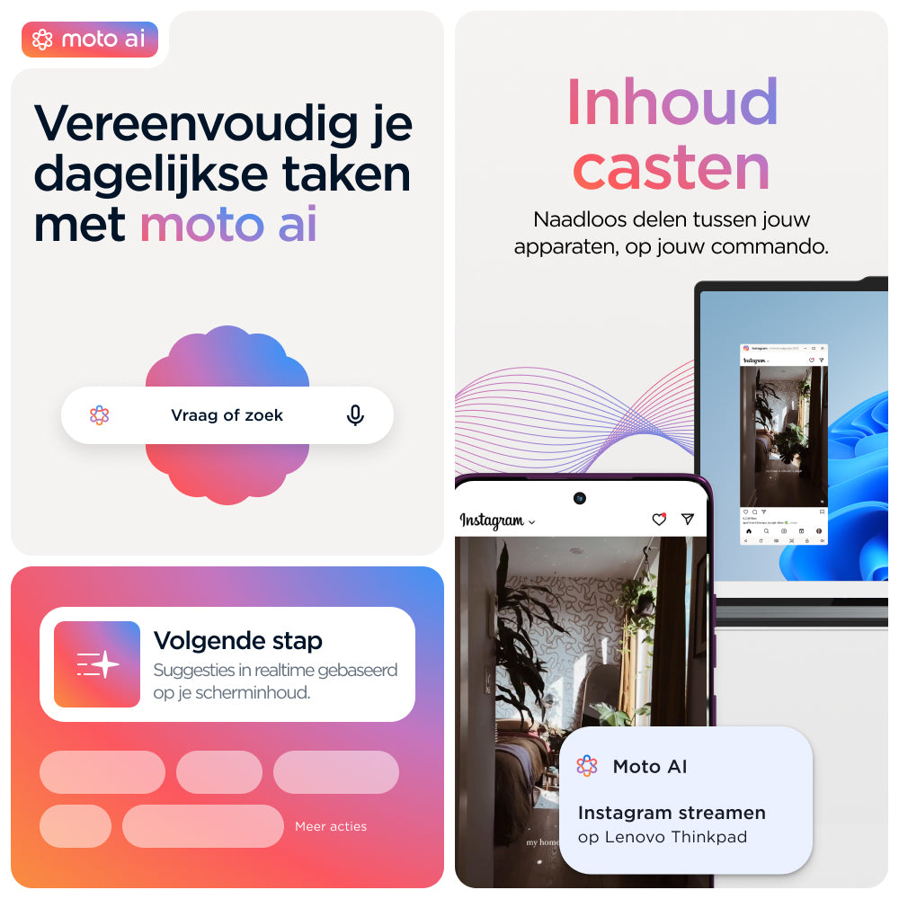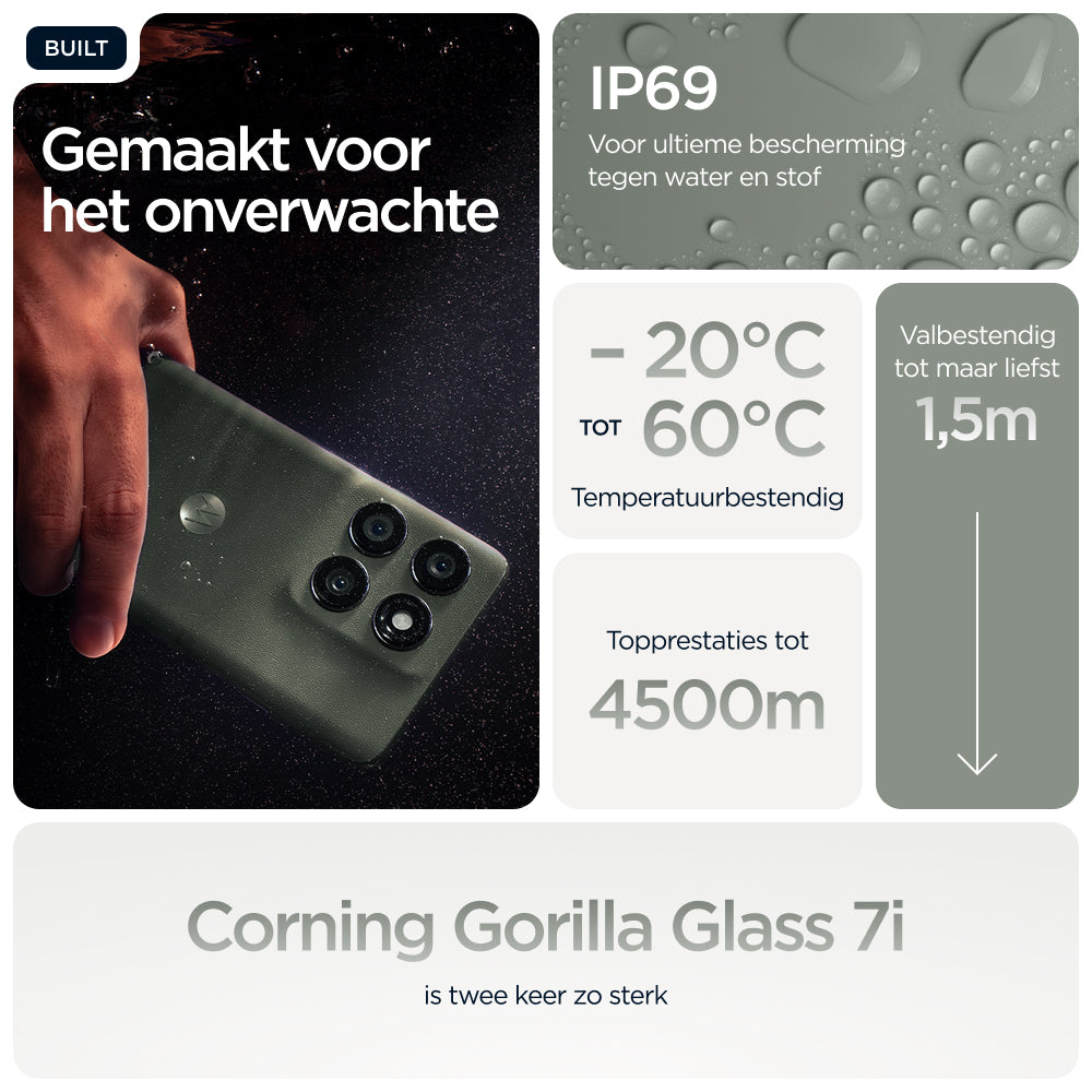 Je verwacht het beste als het gaat om vakmanschap. Maak kennis met de motorola edge 60 pro. Met zijn prachtige design met vier gebogen randen, zachte afwerkingen en door Pantone® geselecteerde kleuren biedt dit toestel het ultieme in stijl en comfort. Maak moeiteloos professionele foto's en video's door eenvoudig de camera te richten en te klikken. Ervaar hoe moto ai je creativiteit stimuleert en je achter de schermen helpt met alledaagse taken. Reken op een uitzonderlijk stevige behuizing met zorgeloze bescherming onder water(1) en een design dat voldoet aan militaire normen.(2) Ga non-stop op verkenning dankzij een accuduur van maximaal 45 uur.(4) Ga helemaal op in entertainment op een 6,7-inch Super HD-display (1220p), aangevuld met Dolby Atmos®-geluid. En profiteer van de kracht van met AI verbeterde prestaties binnenin. Geniet bovendien van moto-functies die creatieve vrijheid, moeiteloze interacties en je gemoedsrust bevorderen. Vind je eigen weg met de motorola edge 60 pro.