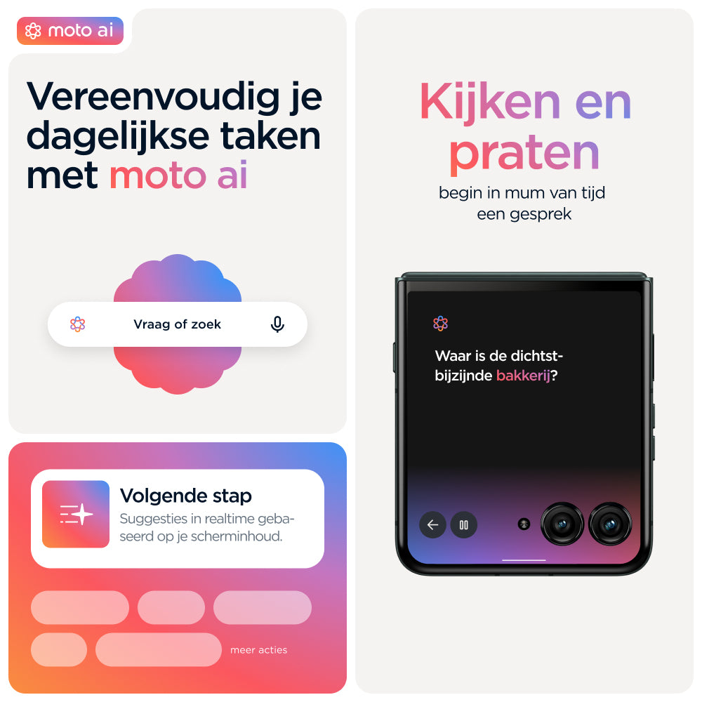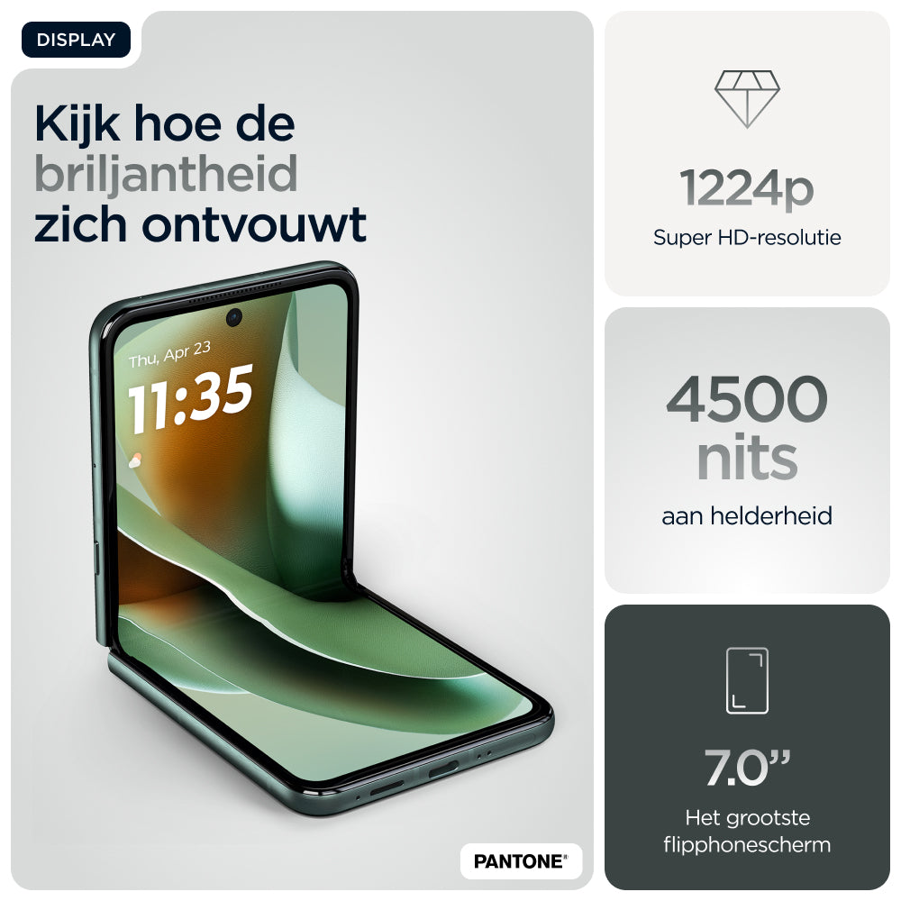 Kies voor slimmer. Kies voor sneller. Kies voor nog iconischer. Maak kennis met de motorola razr 60 ultra. Deze supercompacte en voortreffelijk vervaardigde flipphone is verkrijgbaar met opvallende afwerkingen zoals Alcantara(43) en echt hout, alle in speciaal geselecteerde Pantone-kleuren. Krijg eenvoudig toegang tot je favoriete apps op het meest intelligente en interactieve externe display. Dat alles zonder je smartphone open te klappen. Maak professionele foto's en video's en profiteer van persoonlijke hulp dankzij de naadloze integratie van moto ai(1). Alles gaat sneller met het toonaangevende Snapdragon® AI. En laad sneller op dan met elke andere flipphone(2) dankzij 68 W TurboPower™. De nieuwe motorola razr 60 ultra. Jouw toestel, jouw stijl.